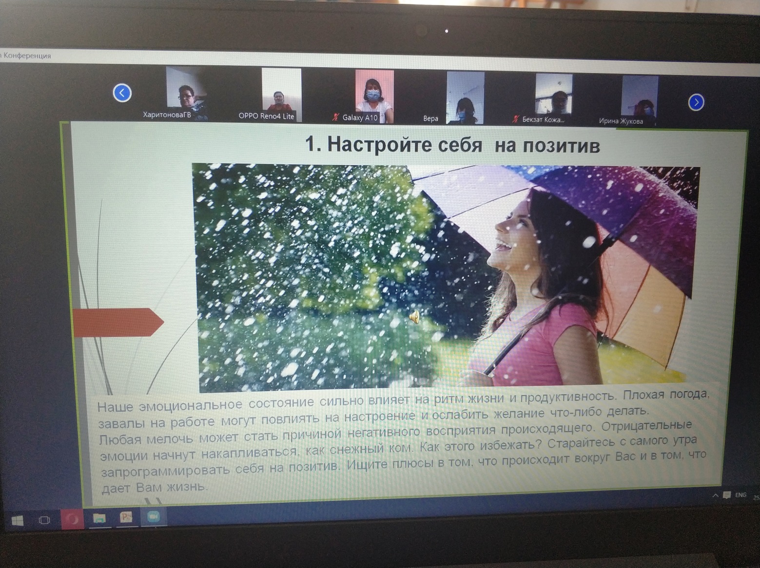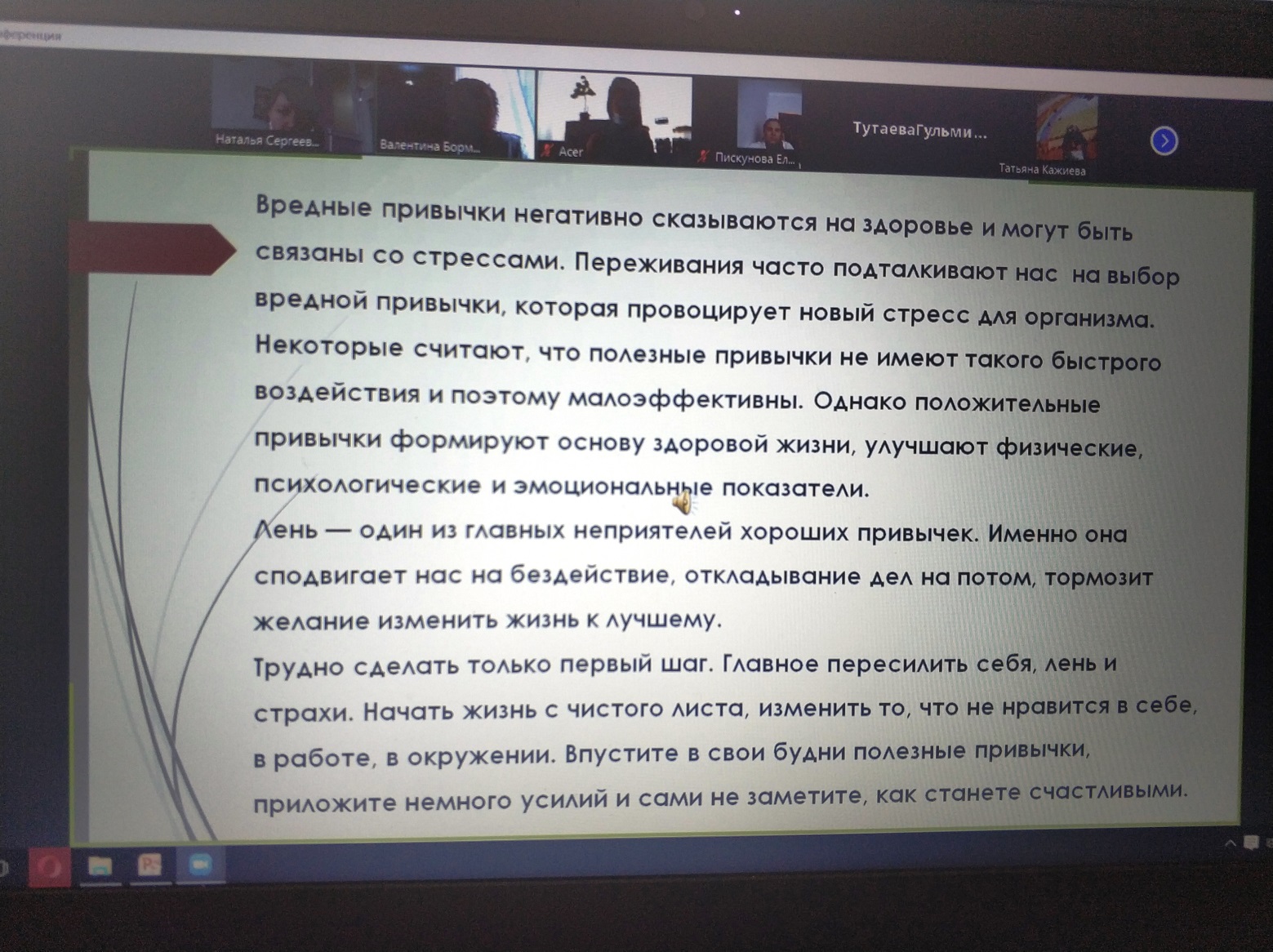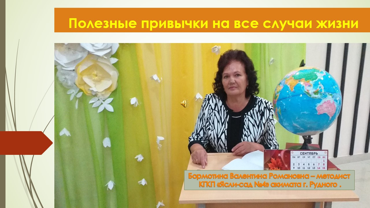 2021 жылғы 25 қаңтарда Рудный қаласы әкімдігінің «№4 балабақшасы» КМҚК ұжым үшін ZOOM платформасы арқылы оң әдеттер туралы түсіндіру жұмыстары жүргізілді. «Барлық жағдайларға пайдалы әдеттер» тақырыбы бойынша. «Пайдалы әдеттер туралы» презентация дайындалды, әдіскер В.Р. Бормотина және №4 б/б ұжымы сөз сөйледі.