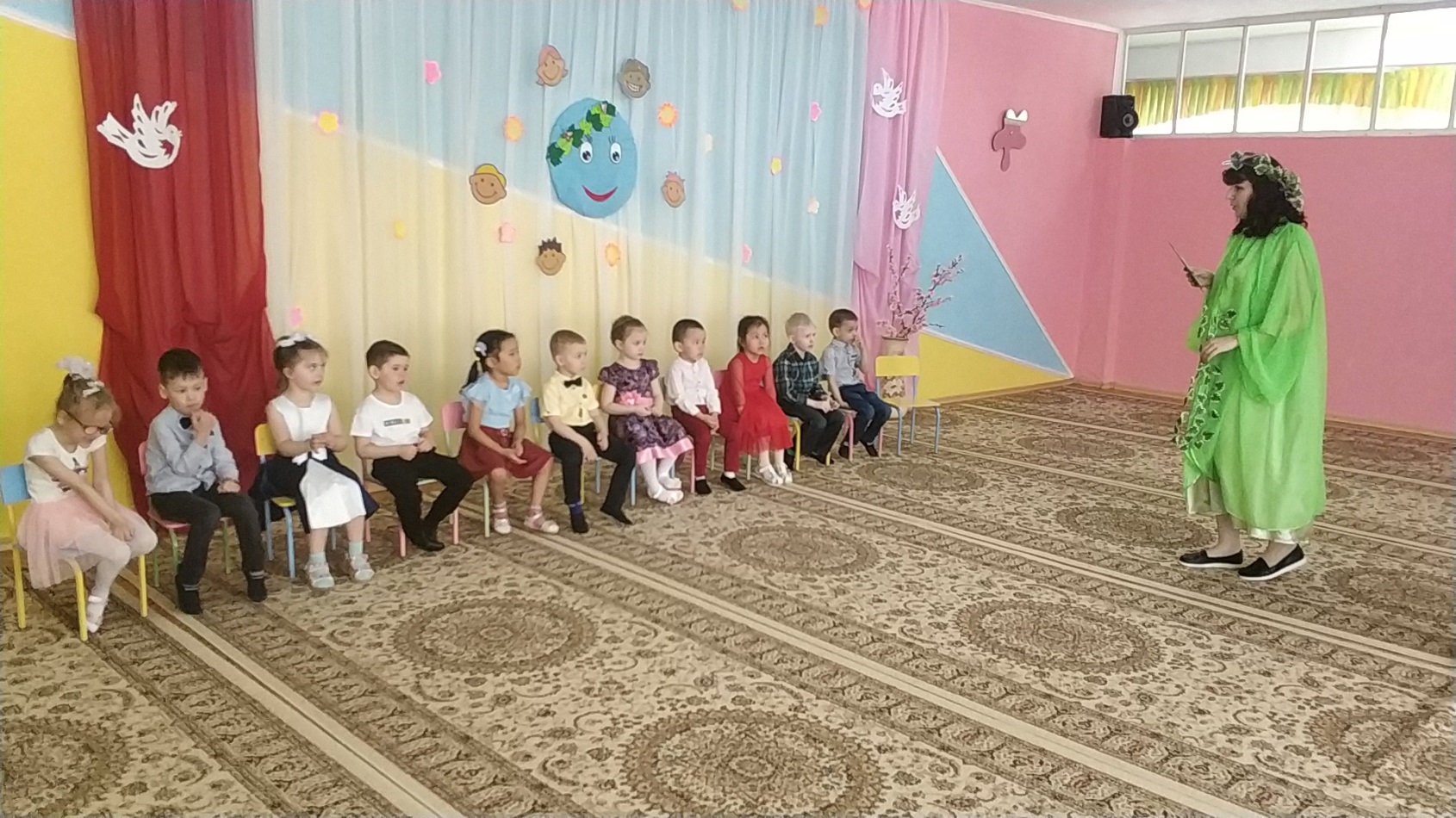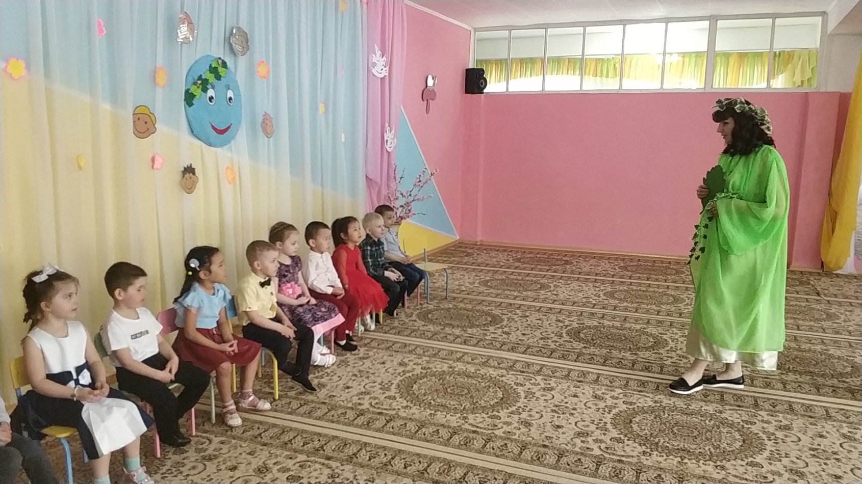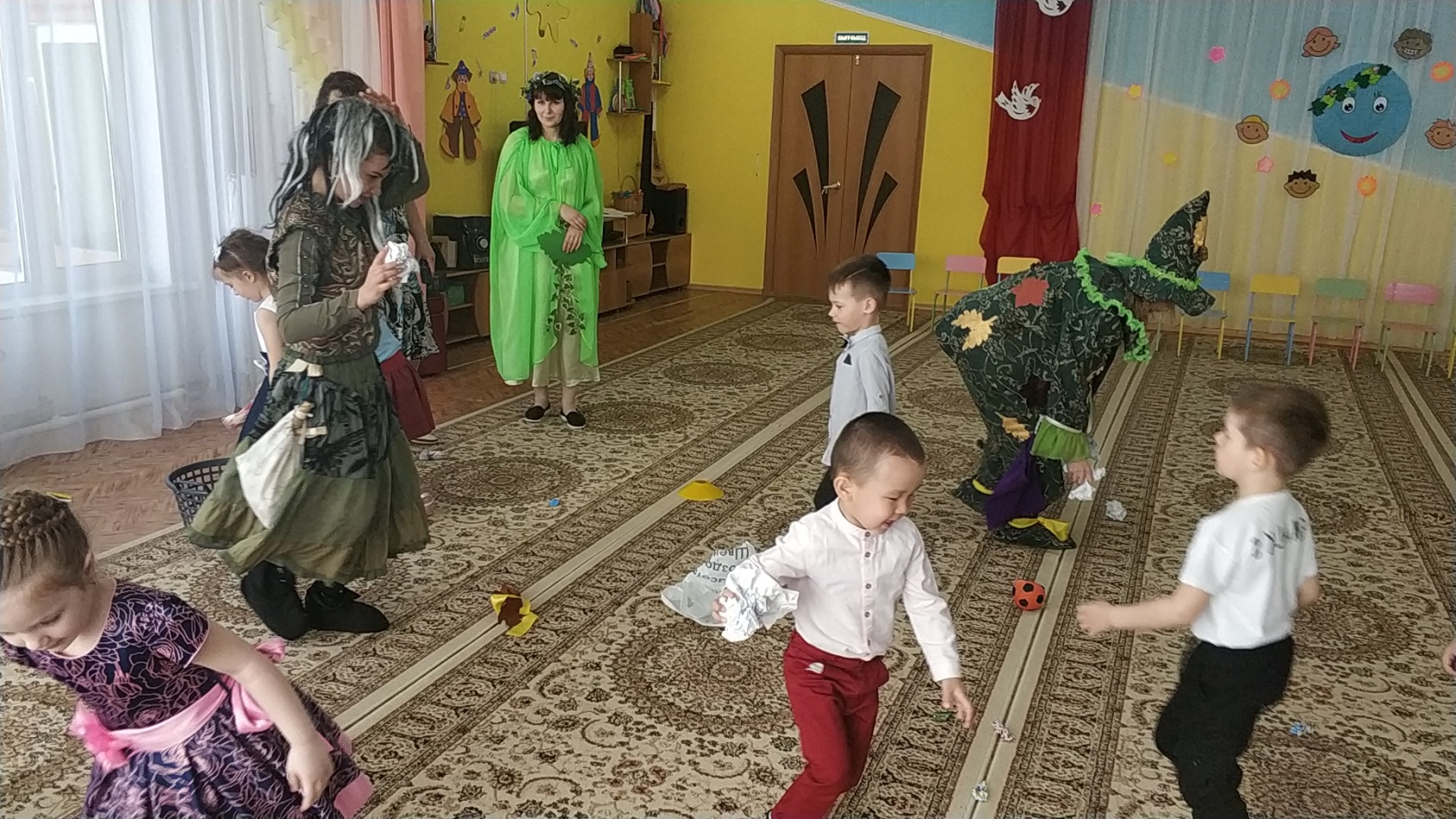 Аға және мектепалды топтарда өткен музыкалық-спорттық ойын-сауықтарда педагогтар балалармен біздің планетамыздың қорғауға мұқтаж екендігі туралы әңгімелесті. Бәрімізге не керек, онда бақтар гүлдейді, аспанда күн жарқырап, балалардың күлкісі естілді. Ойын-сауық көңілді және қызықты өтті. Орман ертегісінің шақыруын қабылдап, балалар ормандағы мінез-құлық ережелерін қайталап, "көктемгі дөңгелек би" және логоритмика әнімен балалар жасыл патшалыққа аттанды. Алдымен олар гүл шалғынына барып , онда Кикимора мен Лешего орман алыптарын кездестірді, олар қоқысты бүкіл клирингке шашыратты, құстарды қорқытты, ағаштарды сындырды. Лесная Фея қарсы алып, қонақтар қуана-қуана және сол уақытта грустью, бұл төтеп беру мүмкін бұзушылармен орман тәртібін, сұрады, балаларға көмектесу. Балалар "ән салатын құстар" ойынының көмегімен торғайлар сияқты айқайлады, қарғалар сияқты айқайлады, сиқыршылар сияқты сыбырлады және куку сияқты қуырды, сондықтан барлық құстар орманға қайта оралып, көңілді және абайсыз ән айтты. Барлығы билегісі келді. Содан кейін қоқысты алып тастаңыз және бұзақыларға табиғаттағы мінез-құлық ережелерін үйретіңіз. Балалар өлең оқып, өртті сөндірді, "жануарлар әлемінің білгірлері" ойынының көмегімен су қоймалары мен жер тұрғындарын әдеттегі туған жерлеріне қайтарды.
