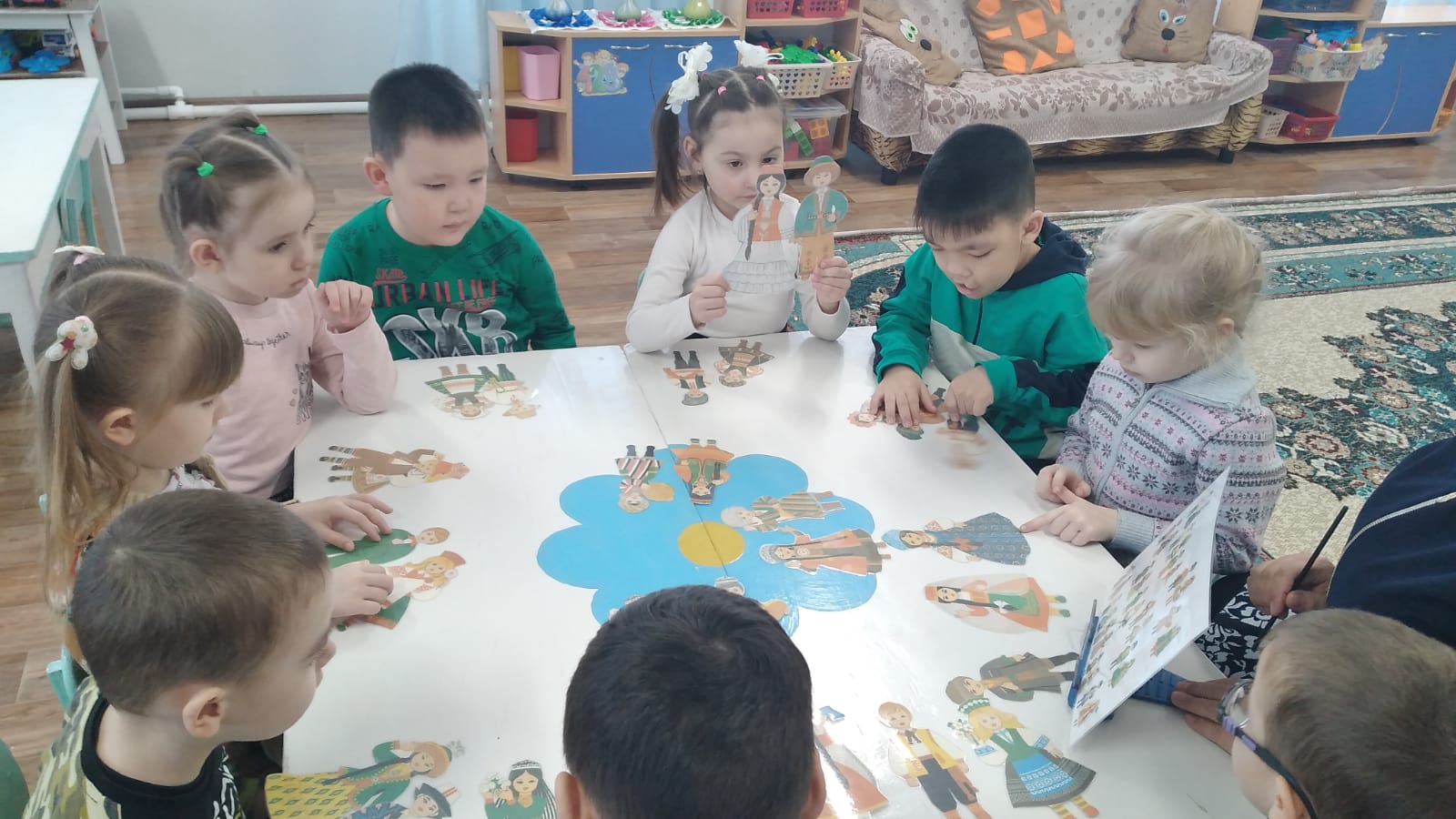 С детьми была проведена игра " Найди пару". Где дети находили сходство и отличия национаных костюмов разных народов. Сомиков Андрей и Штро Анастасия прочитали стихотворение М.Жумабаева "Язык отцов".