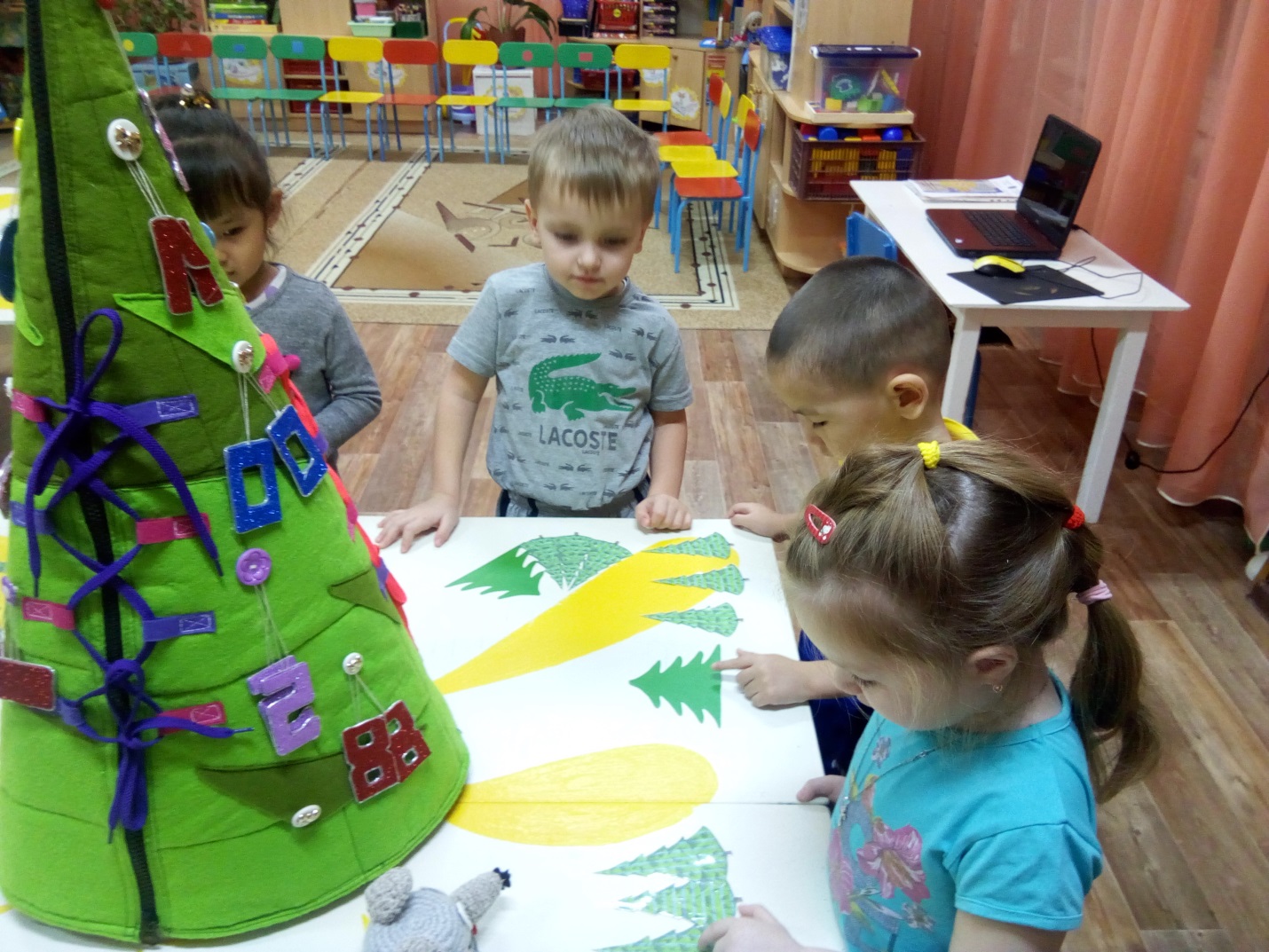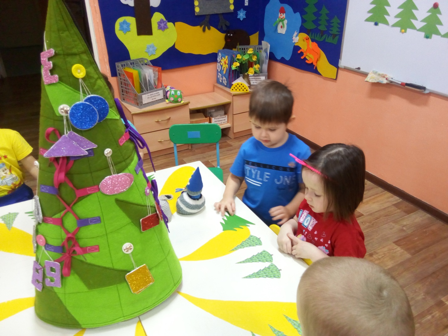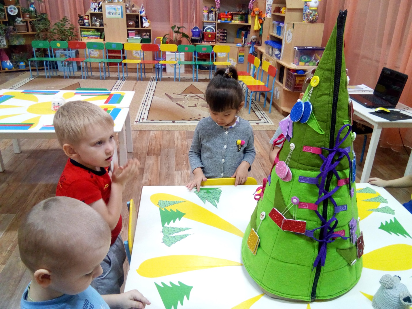 В преддверии Нового года в группу изготовили методическое пособие «Ёлочка» семья Важениной Саши. Ёлочка не только радует детей красотой, но и стала для детей интересной и развивающей игрушкой.. Мы стали использовать данное пособие для развития мелкой моторики, для знакомства с геометрическими фигурами, знакомить детей с числами от 1 до5; упражнять в соотношении количества с цифрой, закреплять знания детей об основных цветах, о величине предметов и т.д