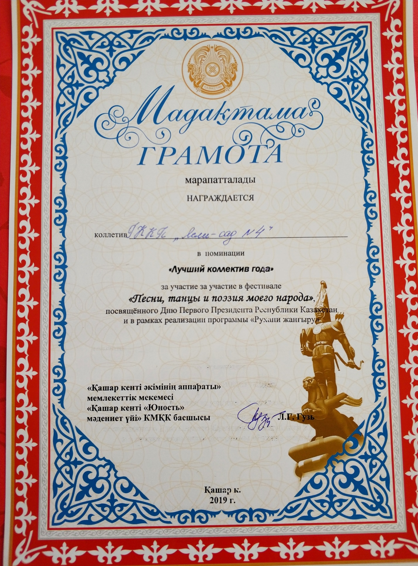 6 декабря 2019 года в ДК "Юность" прошёл концерт посвящённый Дню Первого Президента Республики Казахстан. Наш коллектив принял активное участие и был награждён в номинации "Лучший коллектив года".