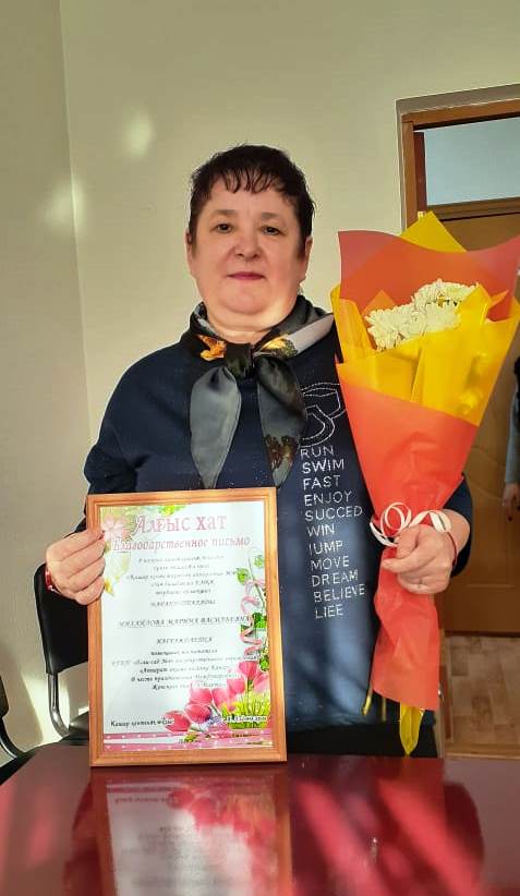 В честь празднования «Международного женского дня» - 8 марта, Аппарат акима поселка Качар наградил «Благодарственным письмом» помощника воспитателя 3 группы «Солнышко» Михайлову Марину Васильевну, поздравляем вас, желаем здоровья, дальнейших успехов вам, вашем нелёгком труде!