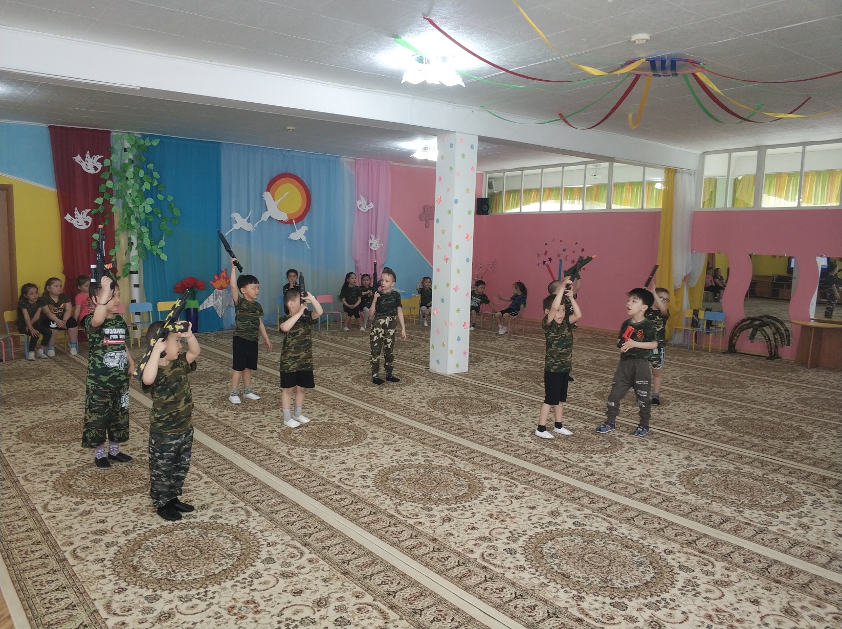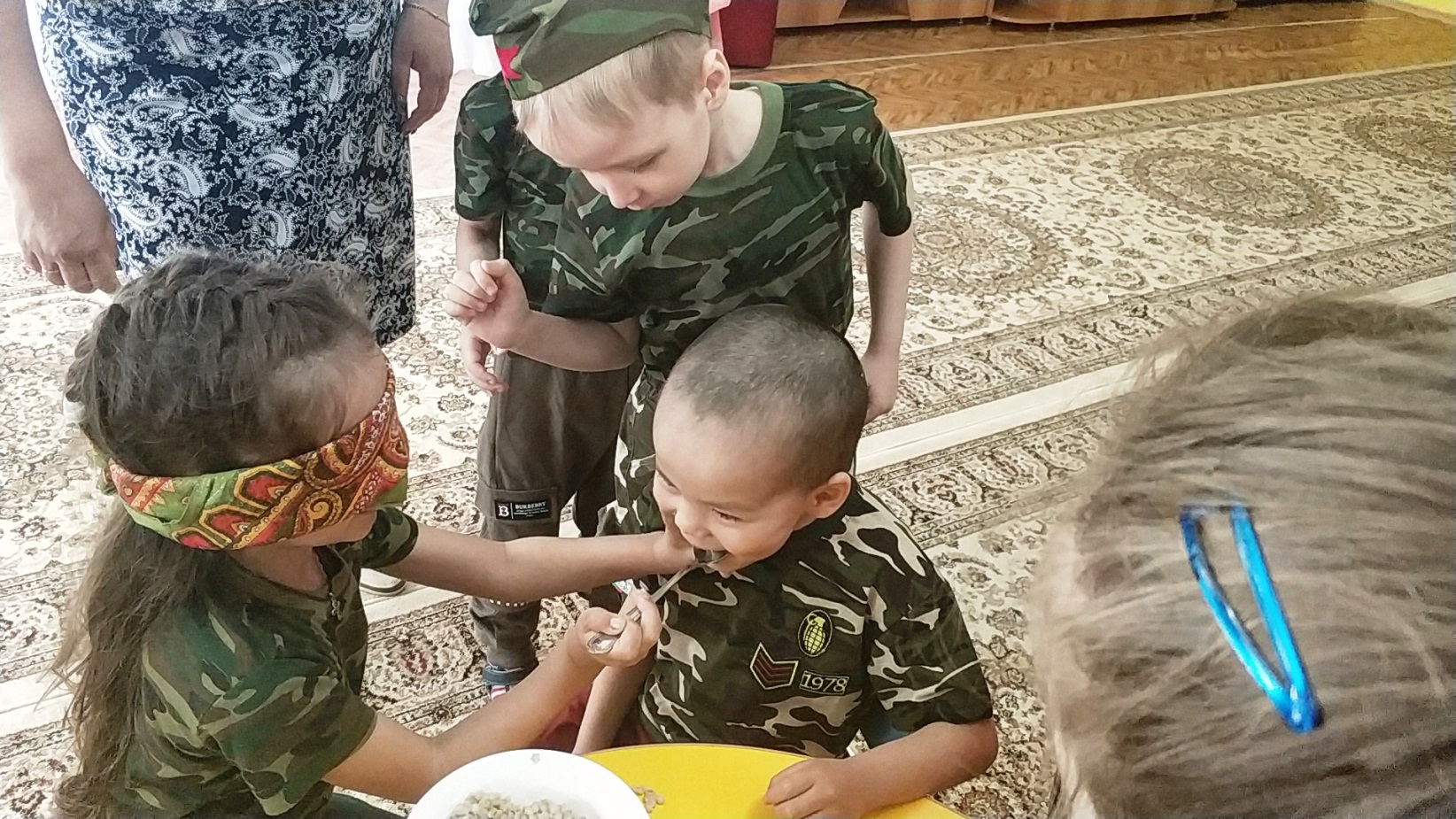 А парадом управлял «главнокомандующий». Дети подготовились к торжественному шествию, показали музыкально-ритмические упражнения «На параде» , читали стихи посвященные победе в ВОВ, слушали фонограмму «Левитан объявляет о начале войны», играли в игры «Разведчики», «Будь внимательным», «Связисты». На привале попробовали настоящую фронтовую кашу. Танец «Пацаны в строю стоят» вызвал гордость за наших будущих защитников. Главнокомандующий обратил внимание детей на горящую свечу. Рассказал о вечном огне, который постоянно горит в честь погибших солдат. Фонограмма «Левитан объявляет о победе» затронула душу и детей, и присутствующих взрослых. Появились неподдельные слезы радости. Утренник закончился песней «Солнечный круг», флэш-мобом и словами пусть всегда будет МИР!