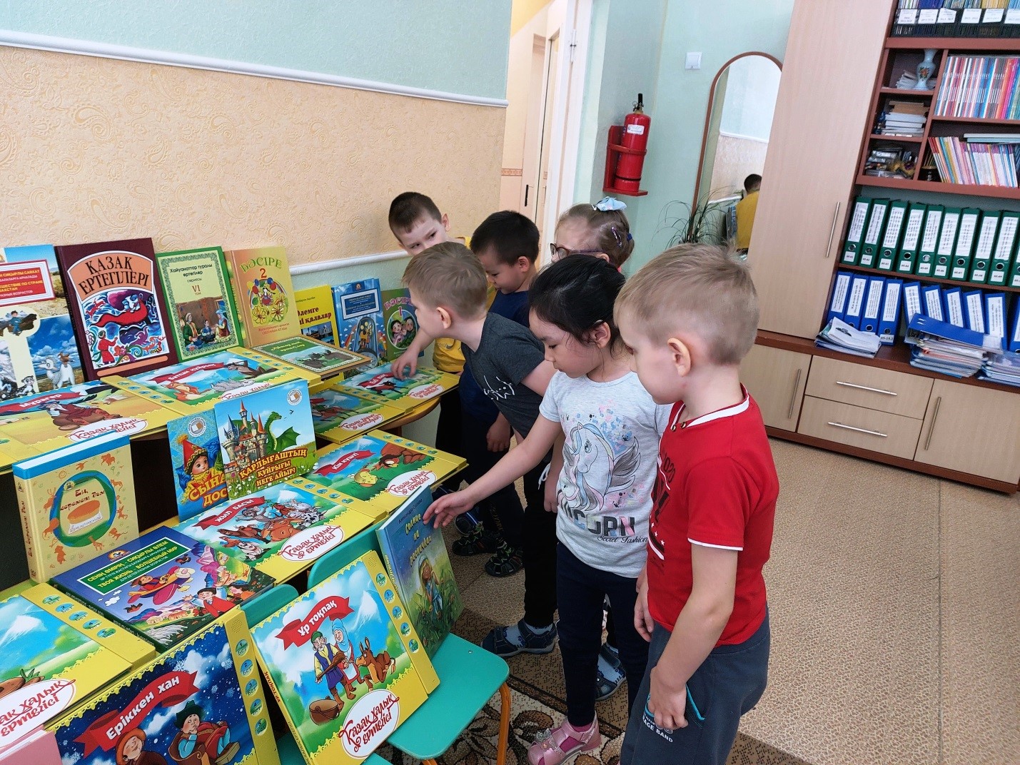 Реализация данной технологии началась с оформления «книжного уголка», в котором систематически организуются различные выставки. Используя различные речевые технологии (билингвальный компонент, театрализованная деятельность, мнемотехника и дидактические игры.) педагоги работают над языковым погружением в казахский язык.