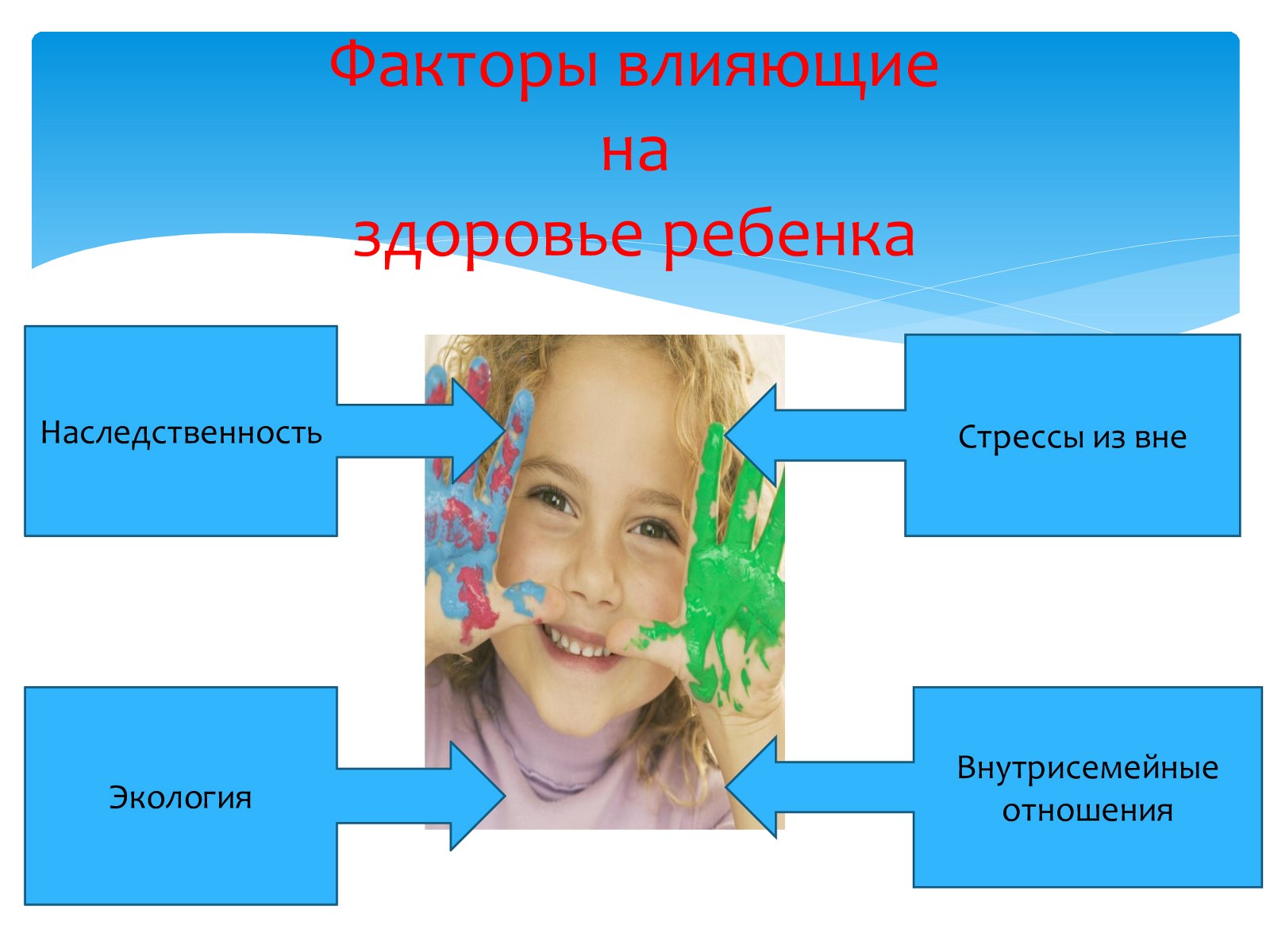 Учитывая факторы, влияющие на здоровье ребенка, можно сказать одно. «Да конечно исправить наследственность (то что уже дано природой), улучшить экологию отдельно взятая семья не в силах. Но уменьшить, или же совсем удалить из жизни ребенка, стрессы из вне, улучшить внутрисемейные отношения каждому родителю под силу. Задача родителей – сделать жизнь ребенка максимально комфортной с учетом всех психологических особенностей. Помните: поведение и здоровье малыша зависит от его реакции на семейные отношения. Возникает напряженная обстановка дома, проблемы на работе, которые вы несете домой, и почему-то ваше чадо жалуется на различные боли, а то и вовсе заболевает. Что это? Это психосоматические явления. Или говоря простым бытовым языком перенос душевного состояния в физическое, когда наше эмоциональное состояние вызывает нарушения функционирования различных органов нашего тела, ослабевая его защитные функции.