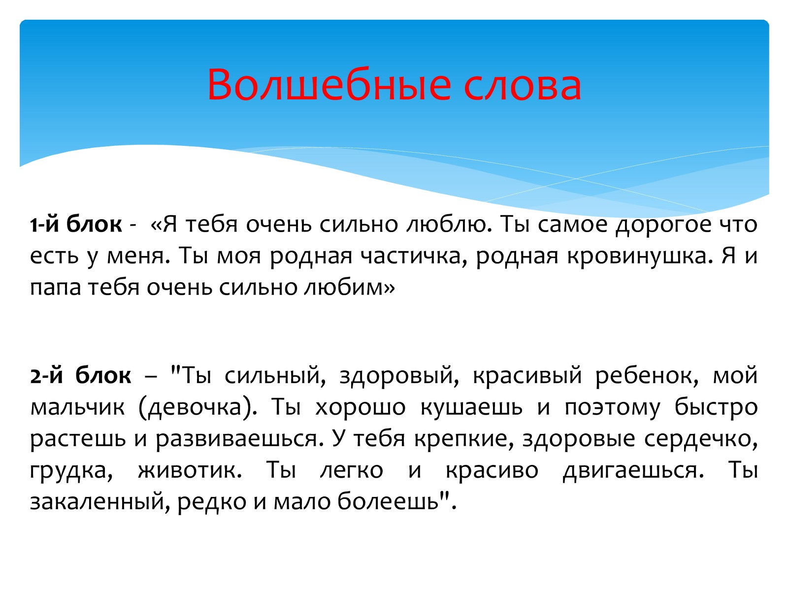 "Ты сильный, здоровый, красивый ребенок, мой мальчик (девочка). Ты хорошо кушаешь и поэтому быстро растешь и развиваешься. У тебя крепкие, здоровые сердечко, грудка, животик. Ты легко и красиво двигаешься. Ты закаленный, редко и мало болеешь".