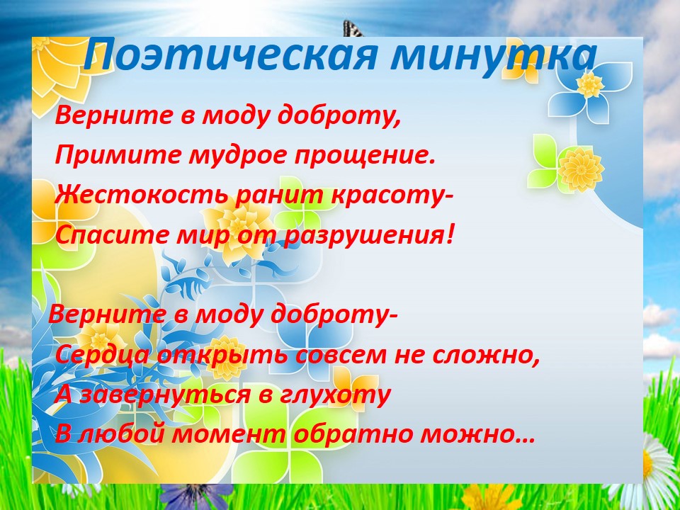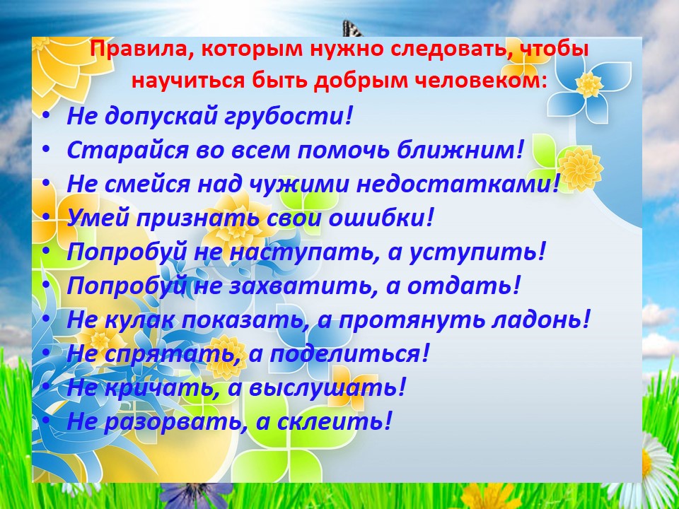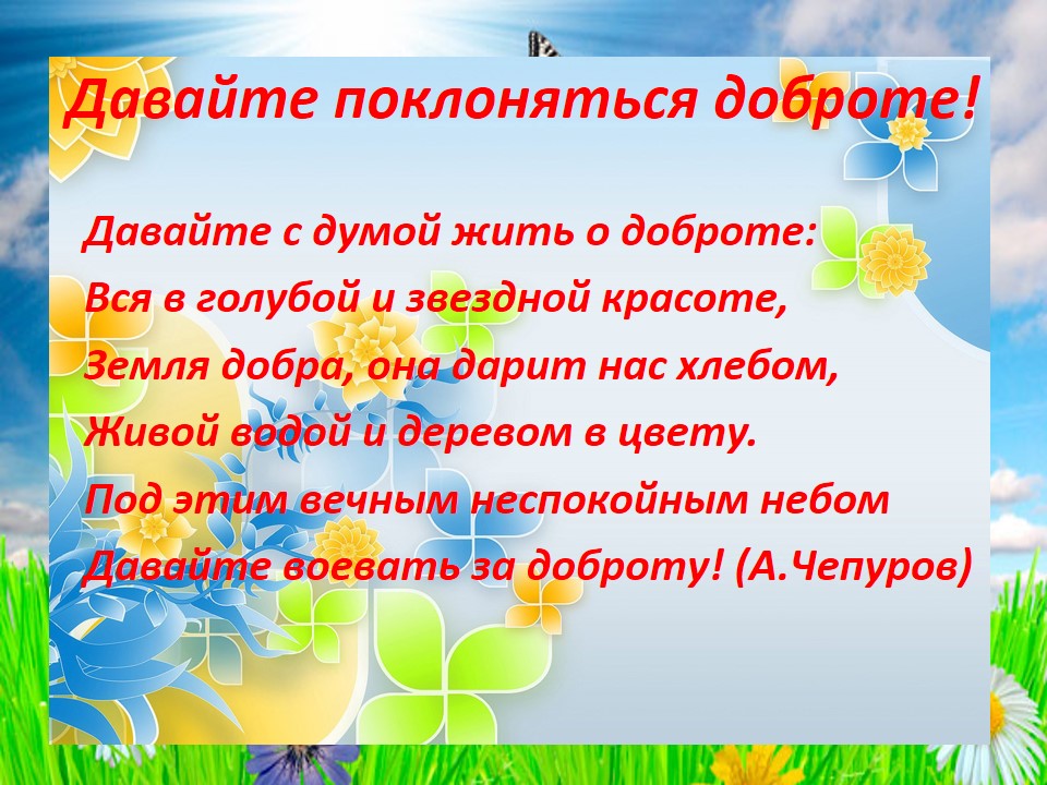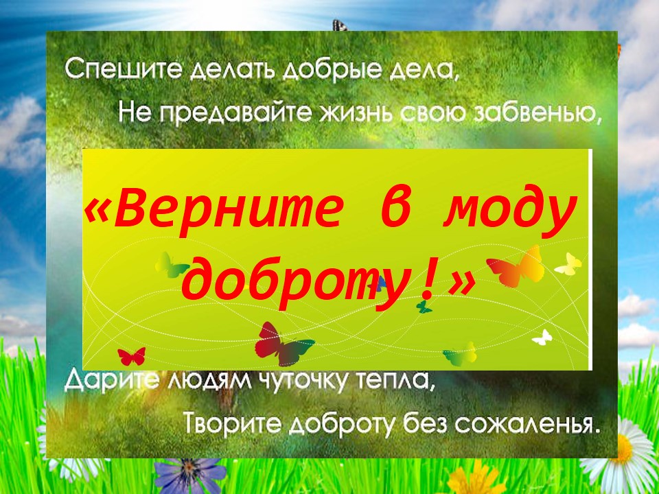 Какими мы хотим видеть своих детей? Добрыми, жизнерадостными, смелыми, умными, уверенными в себе. Мы сознательно ставим качество «доброта» на первое место в своей иерархии ценностей. Потому что хотим, чтобы, наших детей любили, чтобы они жили, окруженные этим прекрасным чувством. Хотим, чтобы они чувствовали себя любимыми (а значит и счастливыми) в семье, в детском саду, в школе, на работе. Дети сталкиваются со злом, предательством, завистью, ненавистью. Жизнь есть жизнь. Но мы не хотим, чтобы они ожесточились, стали равнодушными и циничными, перестали верить в любовь. Пусть они растут добрыми, умеют любить, сочувствовать и прощать. Подобное притягивает подобное.