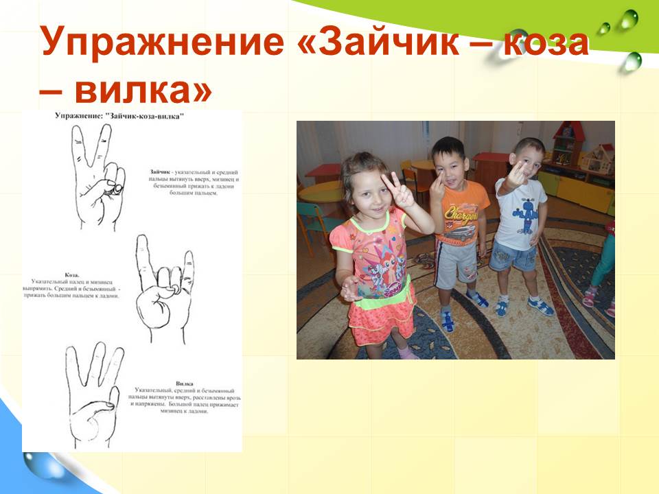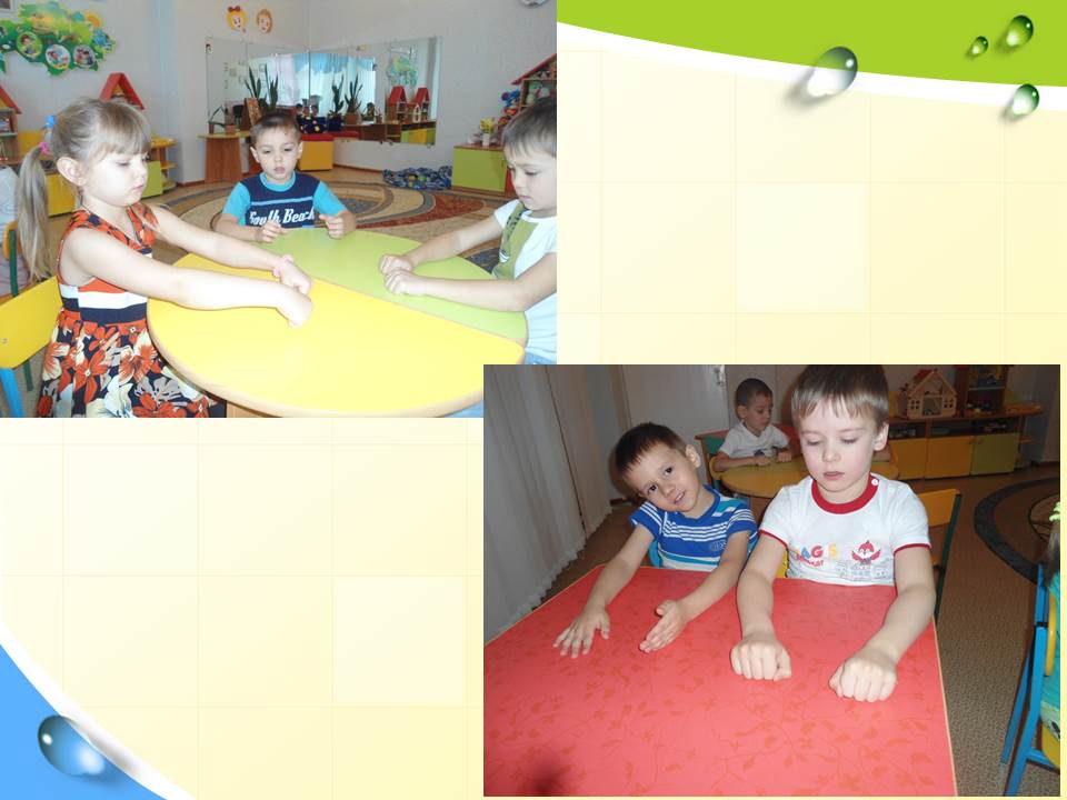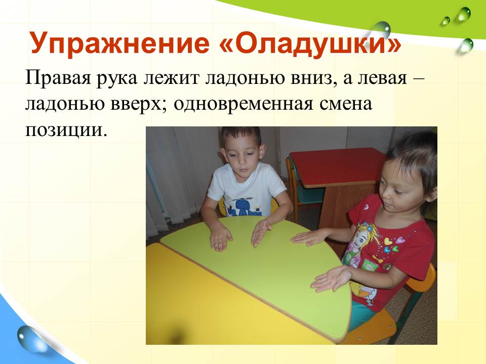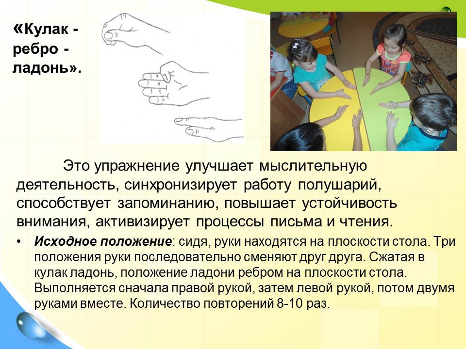 - Ребром ладони дети имитируют пиление по всем направлениям тыльной стороны кисти рук (прямолинейное движение). Кисти и предплечье располагаются на столе, дети сидят.