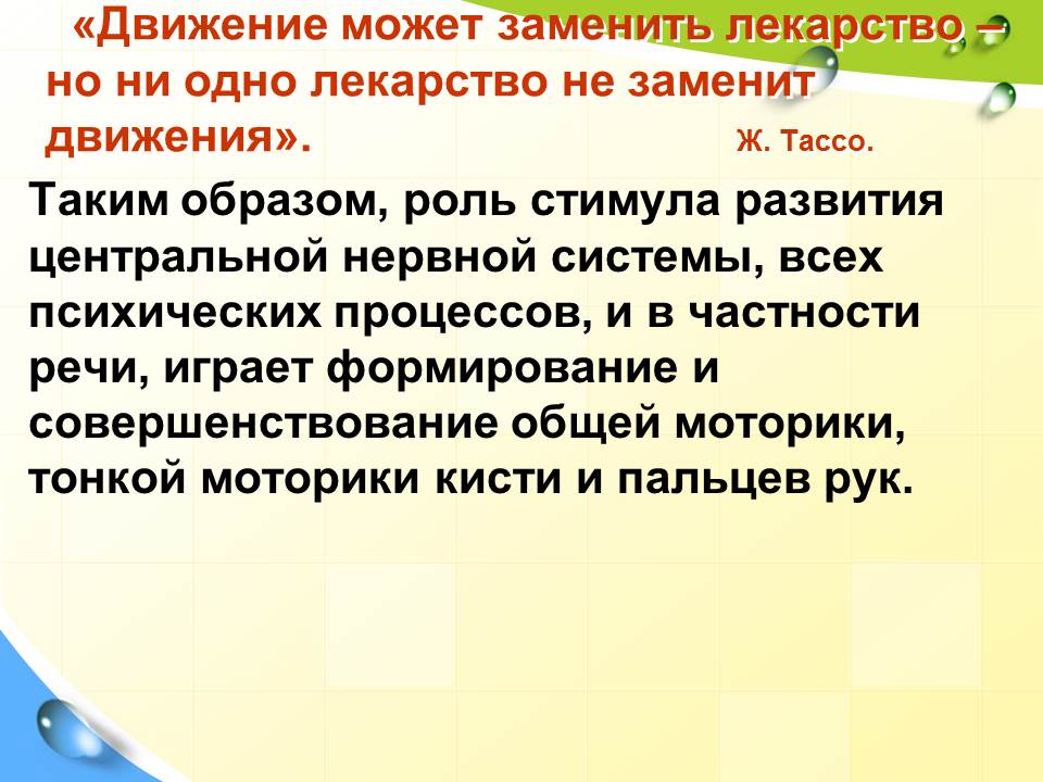 И еще огромное значение для ребенка - имеет мамин голос. Если мама предъявляет к ребенку много претензий, распекает, что он не такой, как хотелось бы, ребенку как бы задается программа неудач и болезней. И наоборот: если этот голос постоянно одобряет, поддерживает, дает установку на счастье, здоровье, то все его процессы приходят в норму. Именно на этом механизме построена методика известного детского психиатра профессора Бориса Зиновьевича Драпкина «Мама-терапия»
