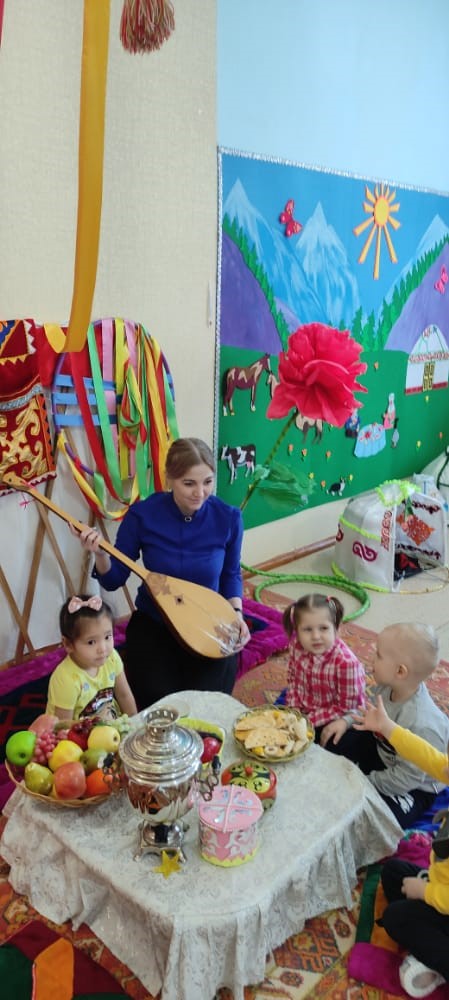 Дети пришли в гости к әже поблагодарить за любовь, внимание и гостеприимство. Познакомились с национальным инструментом домброй. Дети рассмотрели предметы быта поиграли в игру: «Вежливые слова», обыграли ситуации «Как правильно поступить»